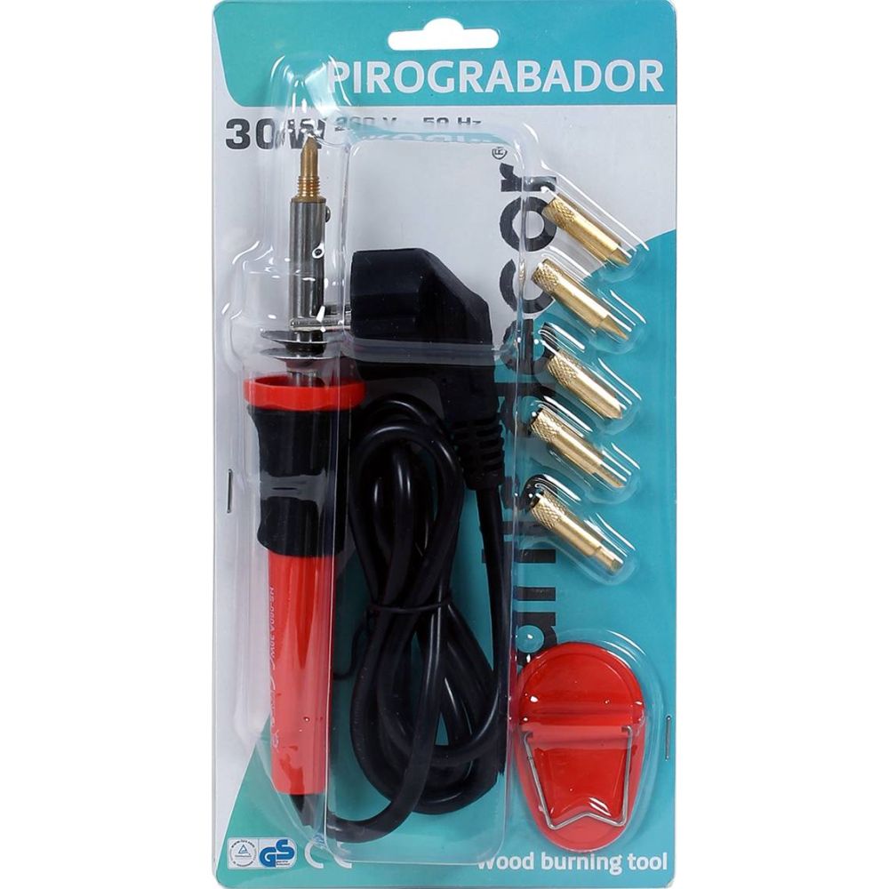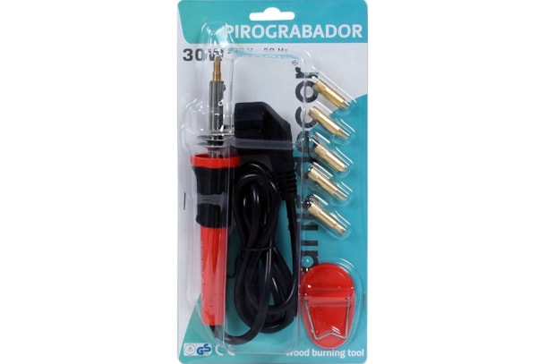 Pirogravador para gravar desenhos, texto e motivos de decoraçao em madeira, coro, contraplacado, etc. Este set contem 5 pontas.