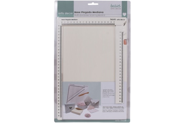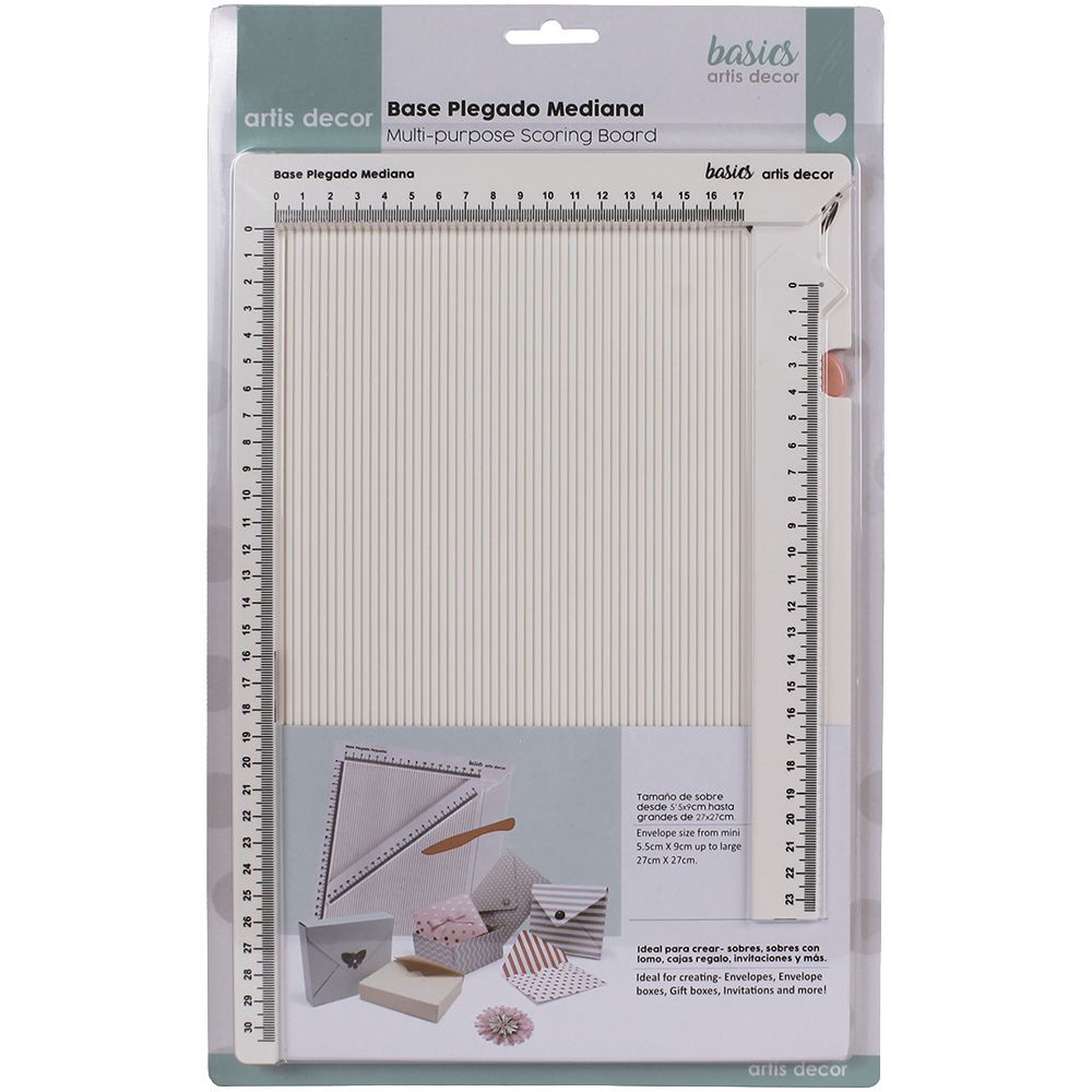 A placa de vincar de tamanho médio Artis Decor é perfeita para criar envelopes, caixas, cartões, convites, pastas e muito mais. As medidas vêm em centímetros. Inclui uma dobradeira para fazer os vincos e tabelas com referências para fazer envelopes e caixas. Também vem com uma régua dobrável de 23 cm.