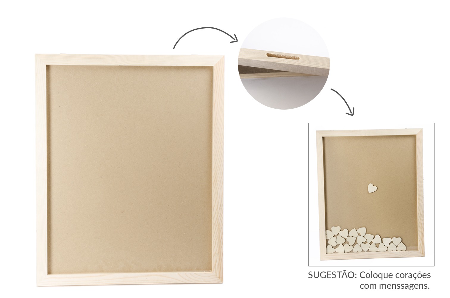 Quadro de madeira com vidro. Ideal para menssagens de casamento. Utilize os corações, ref. 74154, de 4cm (s/ furo)