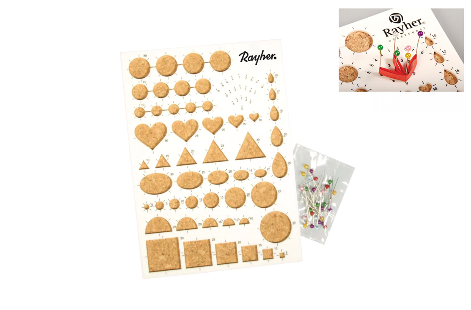 Com este molde de quilling, você pode criar muito rapidamente várias formas. O estêncil tem muitos desenhos diferentes, dessa forma podem ser criadas inúmeras formas uniformes. Graças à placa de cortiça, as tiras de papel podem ser fixadas com os alfinetes fornecidos.