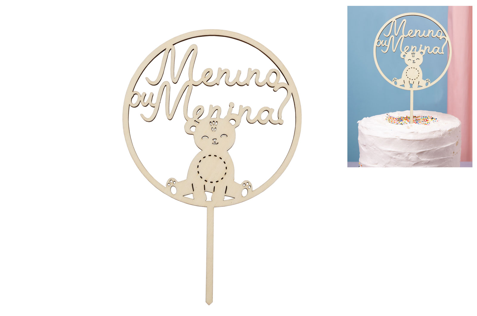 Topo de bolo "Menino ou Menina" para colocar no bolo da descoberta do sexo do bebé. Este topo de bolo é fabricado em madeira, cortado a laser.