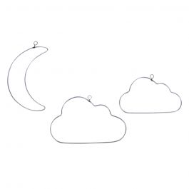 Conjunto de moldes de arame para pendurar. Consiste numa lua de aproximadamente 6x10cm, uma nuvem de aproximadamente 7,3x12cm e uma nuvem de aproximadamente 5,7x10cm. Os formatos de arame podem ser facilmente embrulhados numa ampla variedade de materiais artesanais. Seja com cordão de pelúcia, miçangas, fio de chenille, cordão de lã ou muito mais. Decore o cantinho de dormir do quarto das crianças ou do bebê com lindas nuvens e motivos de lua e crie rapidamente um cantinho aconchegante para dormir.