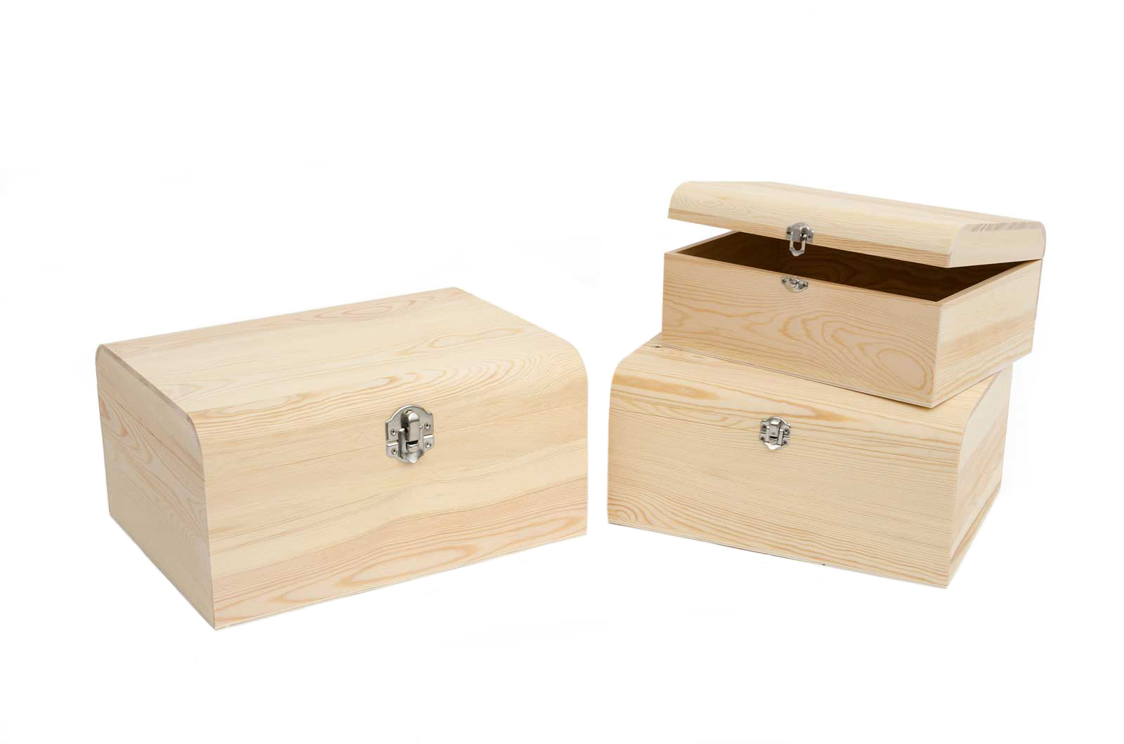 Conjunto de 3 caixas/baús de madeira com dobradiças e fecho. Medidas das caixas: Grande: 35x27.5x17.5cm Media : 30x23.5x15cm Pequena: 27X19.5X11.7cm