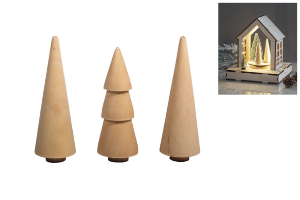 Caixa com 3 árvores de madeira, naturais, 2,9 cm ø, alturas 2x 8,5 cm, 1x 7,5 cm. Base redonda 1,4 cm ø.