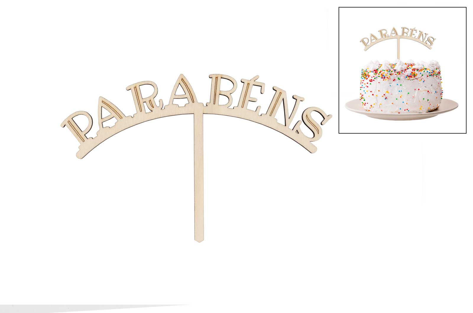 Topo de bolo "Parabéns" fabricado em madeira e cortado a laser. Perfeito para decorar e celebrar dias especiais com estilo.