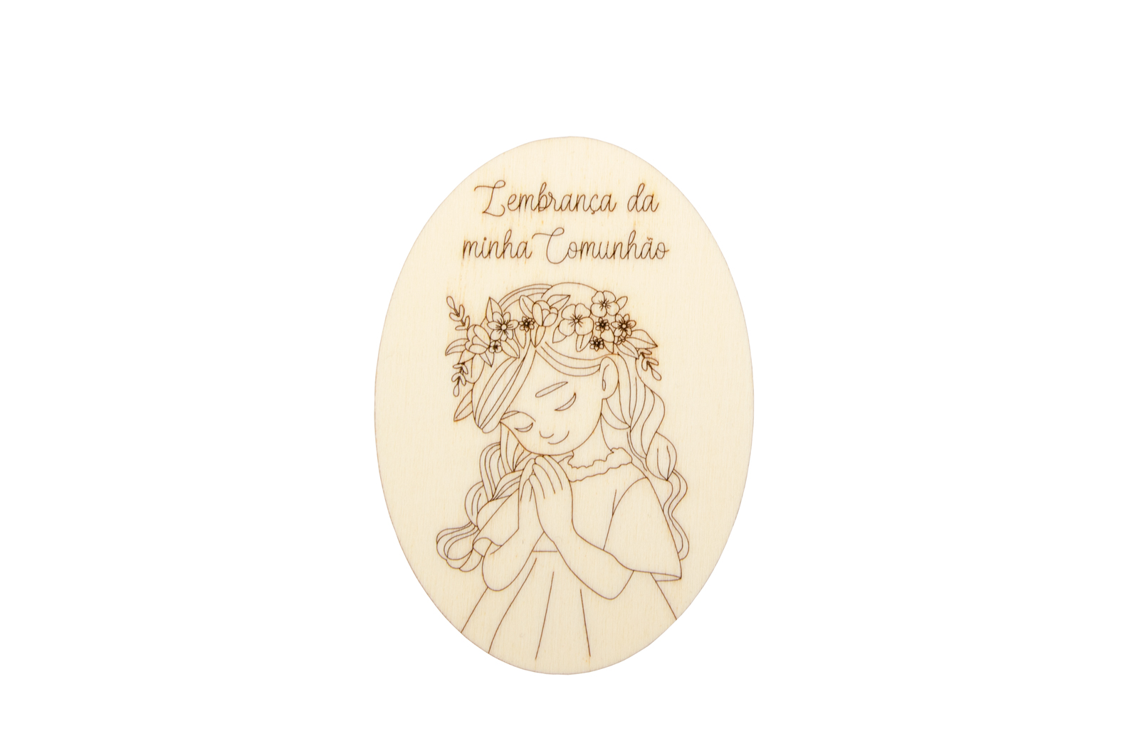 Placa decorativa com uma menina gravada e a inscrição "Lembrança da Minha Comunhão". Perfeita para recordar este momento especial ou oferecer como lembrança.