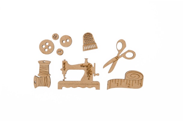 Conjunto de 9 acessórios de costura cortados a laser para decorar. Fabricado em Portugal.