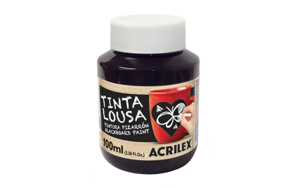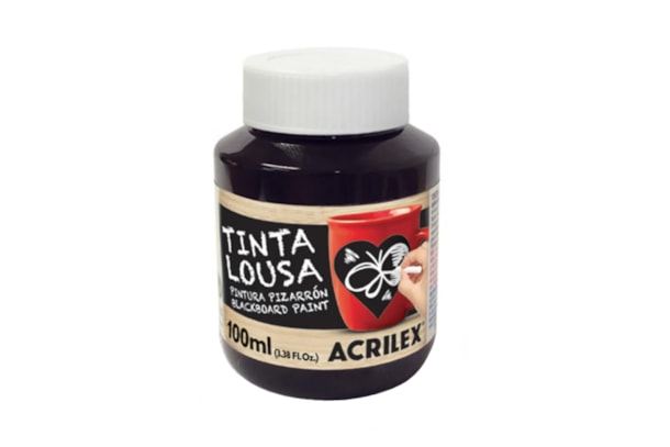 TINTA ARDOSIA PRETO 100ML 01712520 ACRILEX. Pintura para efeito de quadro preto. Pode aplicar sobre vidro, ceramica, porcelana, faienca, mdf, madeira, gesso, papel, cartão e cartolina. Sobre superficies nao porosas, limpar bem o objeto, aplicar o produto e deixar secar 24h. Depois de seco, coloque a peça no forno ainda desligado e deixar aquecer 30mn a 150º. Desligue o forno e deixe arrefecer completamente antes de retirar.