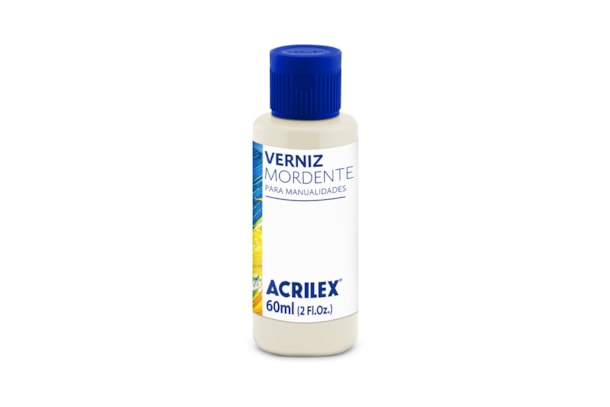 Verniz Mordente Acrilex para fixação de folhas de ouro, prata, cobre, etc. Aplicar sobre superfície limpa e seca, impermeabilizada com Base Acrílica para Artesanato ou Goma Laca Acrilex. Aguardar o ponto de mordência e aplicar a folha com um pincel seco. Remover o excesso de partículas com um pano limpo e seco. Não tóxico e solúvel em água.